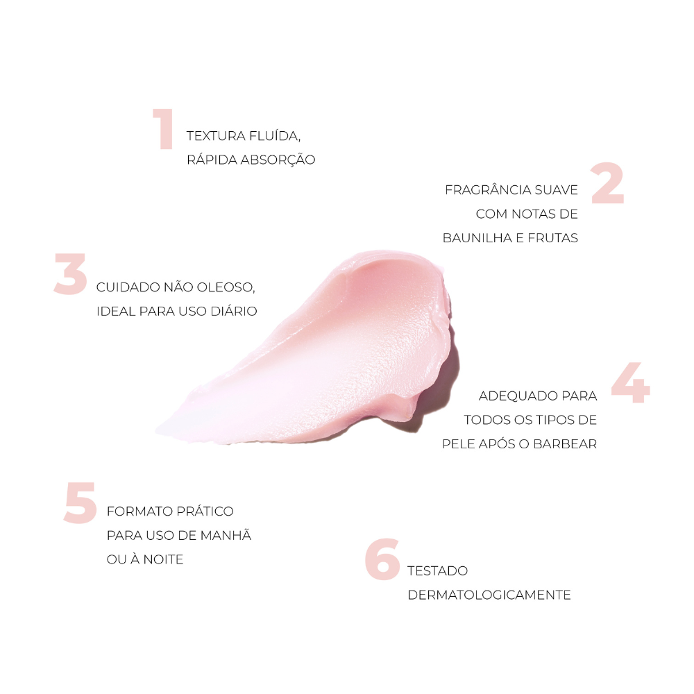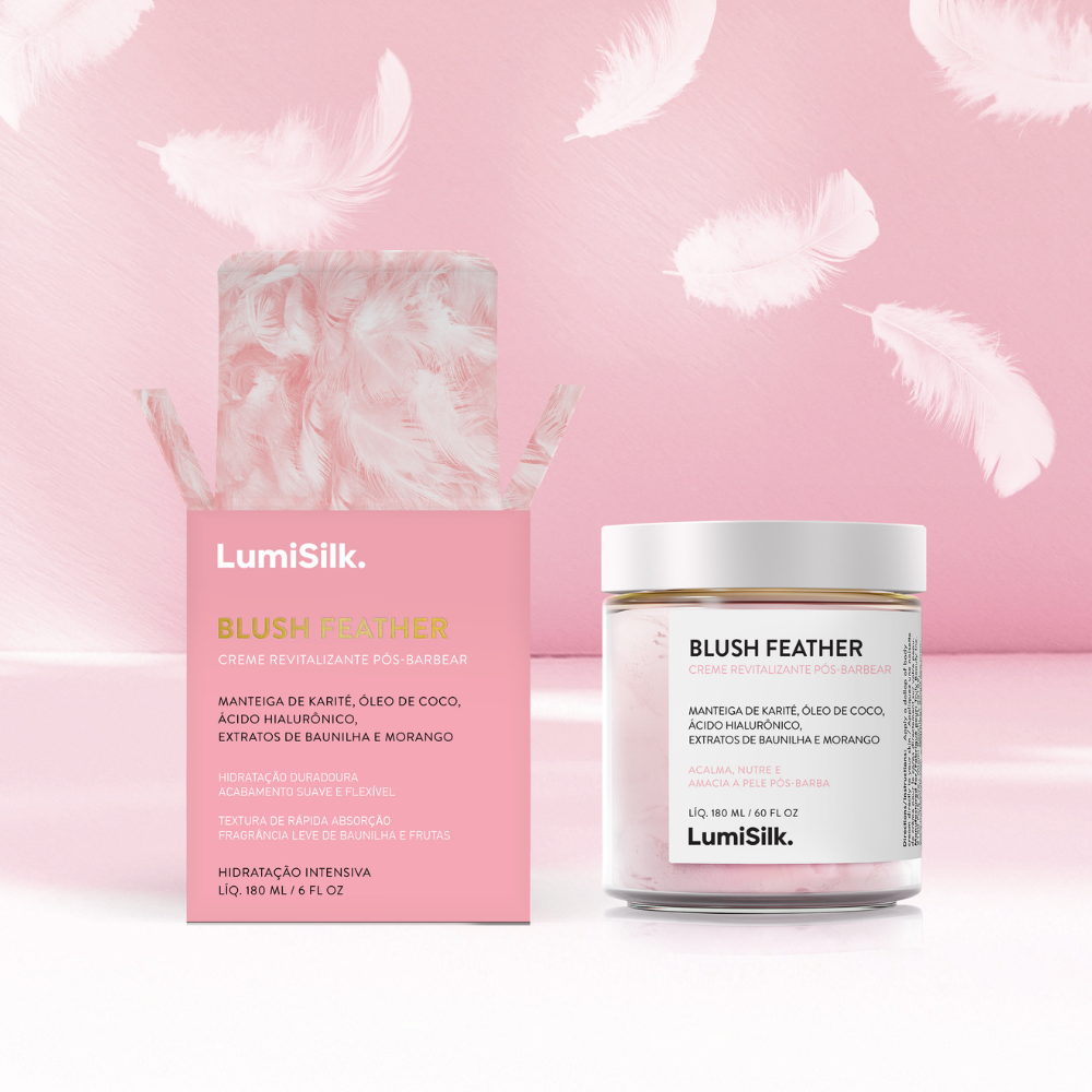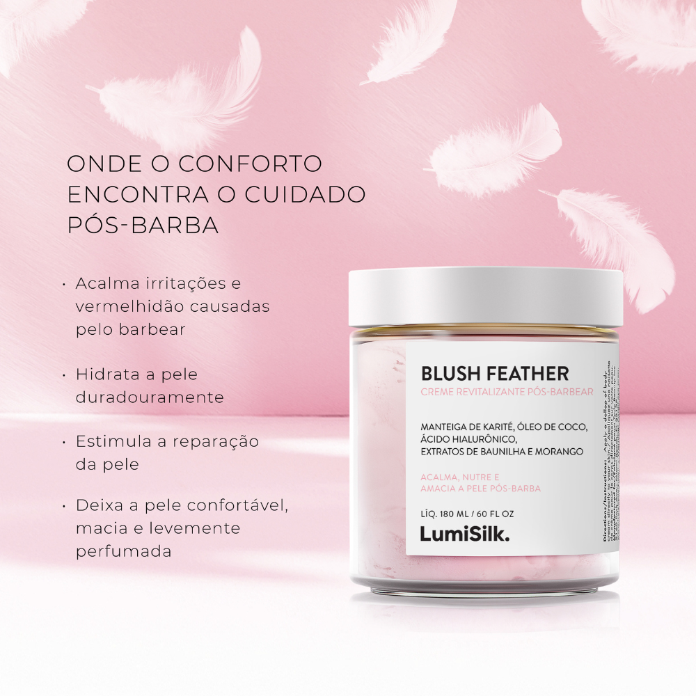 Blush Feather é um creme pós-barbear formulado para acalmar, hidratar e revitalizar a pele após depilar. Ajuda a reduzir as irritações, vermelhidões e sensações de repuxamento, deixando a pele suave e confortável.